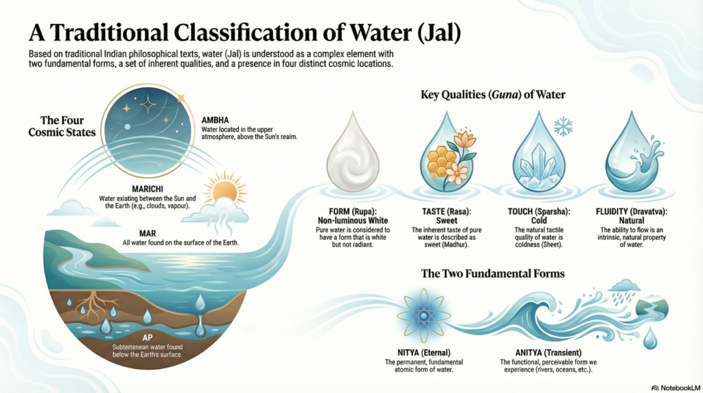 - Nitya (Eternal): Existing in the indestructible “atomic form” known as Paramanu. This is the fundamental, causal reality of water that exists beyond time.